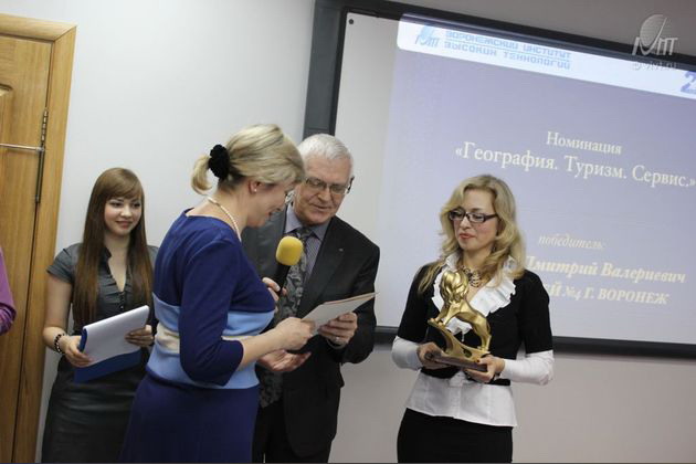 12 апреля 2012 года в 12.00 в Воронежском институте высоких технологий состоялась торжественная церемония награждения победителей и дипломантов общественной премии «Золотой лев». Ежегодная общественная премия «Золотой лев» учреждена в 2006 году Воронежским институтом высоких технологий. Целями премии являются выявление и поддержка молодых ученых; формирование базы талантливой молодежи; привлечение общественного внимания к деятельности и заслугам работников науки, образования, здравоохранения, культуры, искусства, спорта. Премия присуждается на конкурсной основе за практико- ориентированные и оригинальные разработки в предложенных номинациях. Победители и дипломанты награждаются денежными премиями, ценными подарками. Проект является ежегодным, и в 2012 году проводился в седьмой раз. Церемония была приурочена к 20-ти летнему юбилею ВИВТ! Символ премии – статуэтка «Золотой лев», почетные дипломы лауреатов и дипломантов, денежные премии и ценные подарки уже нашли своих обладателей. В номинации «География.Туризм. Сервис»: 3 место Дегтярева Ксения Викторовна МКОУ Бутурлиновская СОШ №1 "Путеводитель Моей малой Родины" 2 место Сафонова Ксения МБОУ СОШ №69 "История развития предприятий сервиса" 1 место Суховерхова Наталия МБОУ СОШ №5 г.Борисоглебск "Экскурсия по Борисоглебску" Золотого льва получил Васильев Дмитрий МБОУ Лицей №4 г. Воронеж с работой «Воронеж- город воинской славы». В номинации «Проблемы экологии»: 3 место: Михайличенко Евгения МКОУ СОШ №3 Россошанский район «Вода из крана: живая или мёртвая?» 2 место: Волкова Анастасия МКОУ «Девицкая СОШ» Семилукский район 1 место: Жукова Анастасия МКОУ «Лисянская СОШ» Лискинский район «Источник жизни» Золотого льва получил Петров Сергей ГОБУ СПО ВО «Воронежский механический техникум» с работой «Экологические проблемы современности. Твой ответ». В номинации «Образовательный ресурс»: 3 место: Кузнецов Александр МКОУ СОШ №25 с УИОП Россошанский район «Математика в компьютерном творчестве» 2 место:Учитель ОБЖ Сафонов Всеволод Васильевич МБОУ Лицей №8 «Электронный образовательный ресурс по патриотическому воспитанию старшеклассников (сайт о ВОВ)» 1 место:Учитель Степаненко Ольга Владимировна МБОУ БГО «Борисоглебская гимназия №1» «Комплекс электронных образовательных ресурсов для обучающихся начальных классов по информатике и ИКТ» Золотого льва получил коллектив преподавателей: Кузнецова Елена Сергеевна, Зарубина Людмила Владимировна МОЦ «Интерлингва» с работой «Учебное пособие для школьников 6- 11 классов по английскому языку «My city is my pride». В номинации «Социальный проект» победили: 3 место:Старков Александр МКОУ СОШ №2 г. Нововоронеж «Твои герои, Нововоронеж!» Шушерова Ольга МКОУ «Хреновская СОШ №1» Бобровский р-он 2 место:Гончаренко Виталий МКОУ Валентиновская ООШ Кантемировский р-н 1 место и Золотой лев:Ильин Александр, Конева Ольга, Коротков Дмитрий, Слепухова Анастасия, Рощупкин Даниил,Пищугина Татьяна МКОУ Нижнекарачанская СОШ Грибановский р-н с работой «Страна-игралочка». В номинации «Цифровая вселенная: вчера, сегодня, завтра» 1 место:Пушкин Сергей Сергеевич МБОУ «Гимназия №10» Воронеж "История социальных сетей" Золотой лев:Стрюк Надежда Игоревна МБОУ Гимназия №2 Воронеж "Безопасность подростков в социальных сетях"