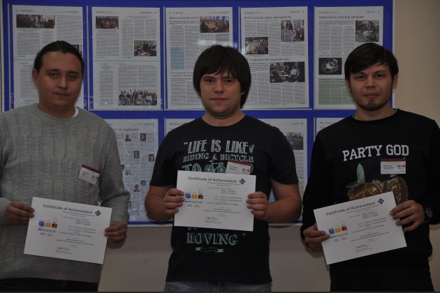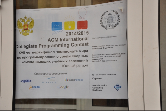 С 20 по 22 октября в Саратовском государственном университете состоялся четвертьфинал чемпионата мира по программированию. В нем приняли участие студенты из Астрахани, Волгограда, Казани, Пензы, Ростова, Ульяновска, Тольятти, Самары. Воронежский институт высоких технологий представляли студенты ВИВТ Олег Марулин, Сергей Супонев и Владимир Агейкин. В первый день прошло открытие турнира, презентация организаторов и спонсоров. После пробного тура, стало возможным выбрать стратегию решения задач. В основном туре наши студенты показали достаточно высокий результат. Команду ВИВТ наградили сертификатами ACM.