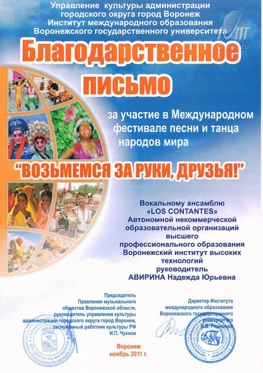 C 26 по 28 ноября 2011 года в Воронеже прошел Международный фестиваль песни и танца народов мира «Возьмёмся за руки, друзья!».